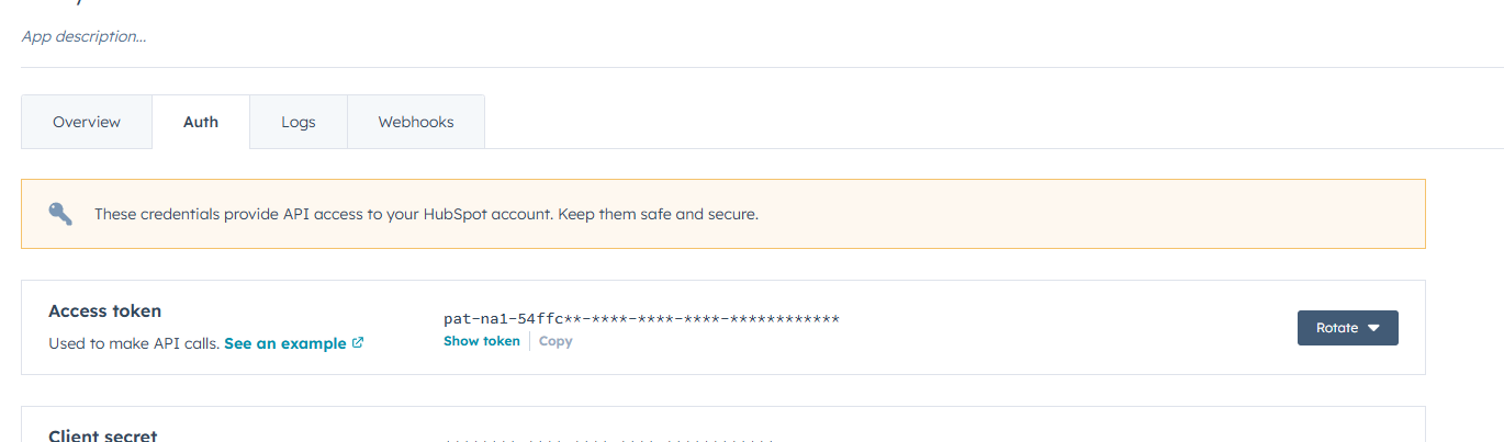 After you've added and confirmed the above scopes, HubSpot will generate your private API key. First click Auth section then click Copy Access Token. you will need it for the integration step.
